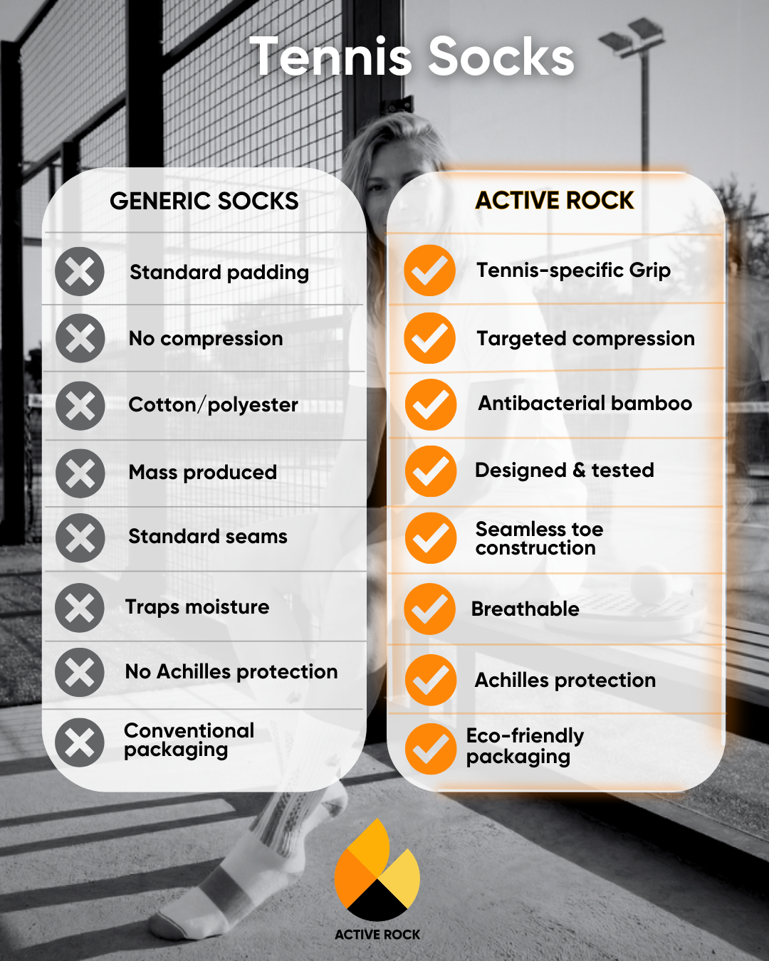 Découvrez la différence Active Rock : nos chaussettes de tennis sont conçues pour les athlètes exigeants. Contrairement aux modèles classiques, les chaussettes de tennis Active Rock offrent une adhérence spécifique au tennis, une compression ciblée et le confort des fibres de bambou antibactériennes.